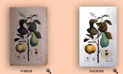 | Entsäuerung Stockflecken- und Lichtrandentfernung Papierverstärkung Papiervervollständigung an den Ecken und an den Rändern Glättung des Blattes |