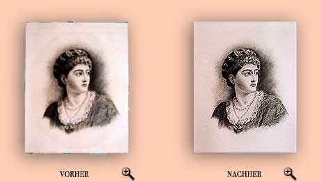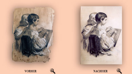 | Entsäuerung Ablösung der alten Montage vom Untergrund des Blattes Lichtränder- und Schimmelpilzbeseitigung Papierverstärkung Glättung des Blattes |