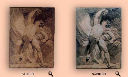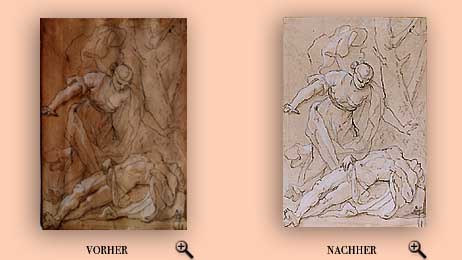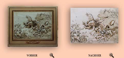 | Entsäuerung Ablösung des Blattes vom Passepartout Stockfleckenentfernung Papierverstärkung Papiervervollständigung in der unteren, linken Ecke Glättung des Blattes |